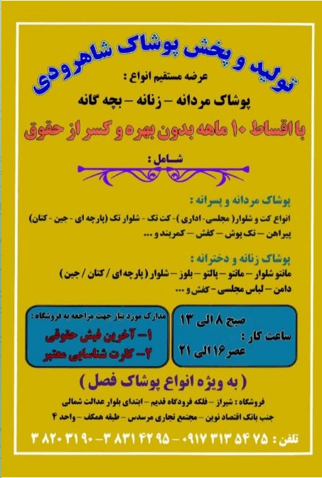 فروشگاه متینپوش شیراز با هدف ارائه خدمات رفاهی به فرهنگیان بازنشسته و موظفین نواحی ۱ تا ۴، شرایط ویژه فروش پوشاک آقایان شامل کتوشلوار، کت تک، پالتو و کاپشن را با اقساط ۱۵ ماهه بدون پیشپرداخت و تخفیفهای جذاب اعلام کرد.